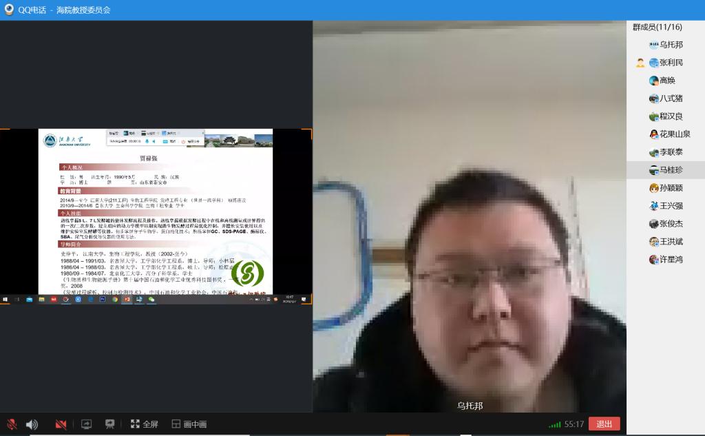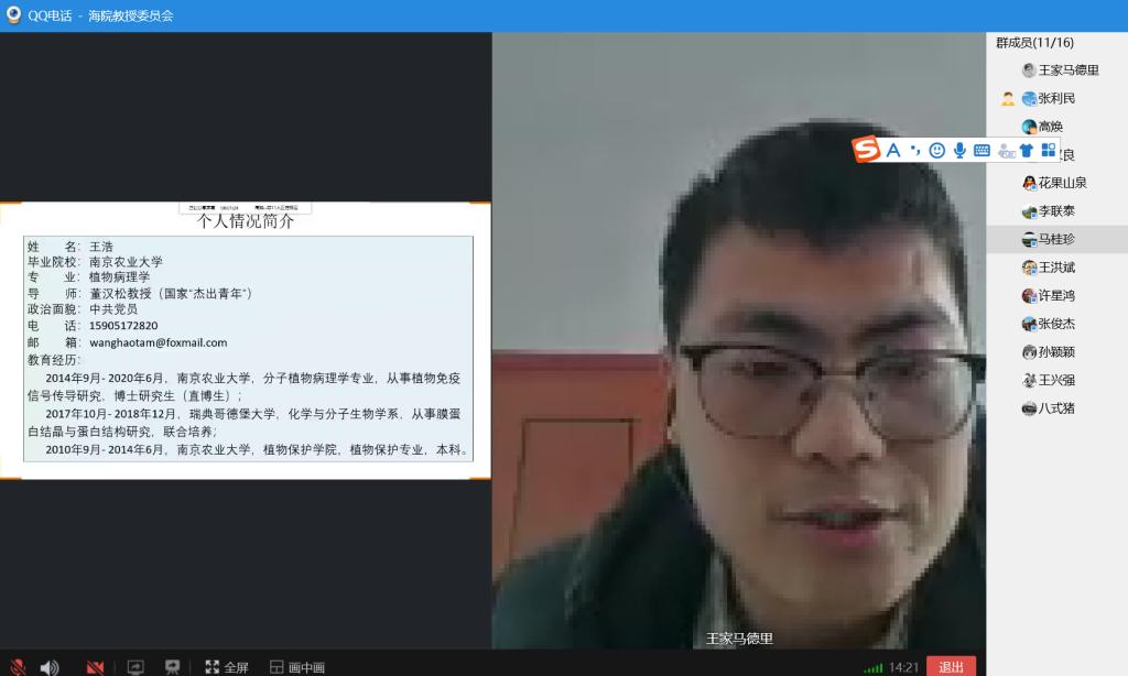 在新型冠状病毒肺炎疫情防控期间,为了进一步加强学院师资队伍建设,贯彻落实学校人才建设“1217计划”,3月7日上午,海洋生命与水产学院组织教授委员会对来自日本秋田县立大学、厦门大学、江南大学及南京农业大学的四位博士进行了远程网络面试。