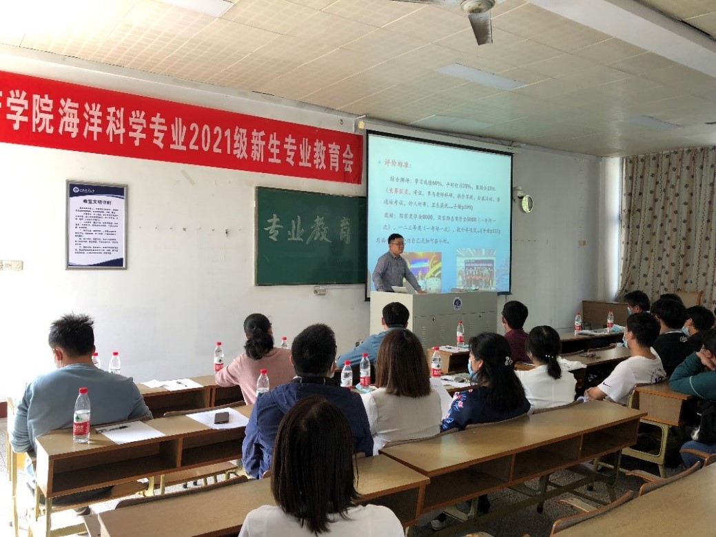 888集团welcome海洋科学系2021级新生专业教育会于2021年10月13日在通灌校区诚意楼T01教室顺利召开,参加会议的有2021级全体新生、学院院长、海洋科学系全体老师及辅导员教师,会议由系支部书记蔡月凤博士主持。