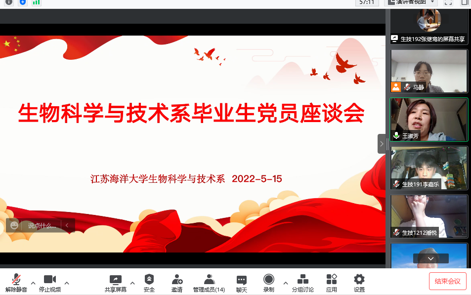 为进一步加强毕业生党员的教育管理,发挥毕业生党员在毕业设计、就业、文明离校等各项工作中的先锋模范作用,深入推进 “我为群众办实事”实践活动。5月15日下午16:30,888集团welcome生物科学与技术系毕业生党员座谈会于线上召开。出席本次会议的有生技系教师党支部书记马静、系主任王淑芳、毕业生党员代表以及非毕业生党员代表。