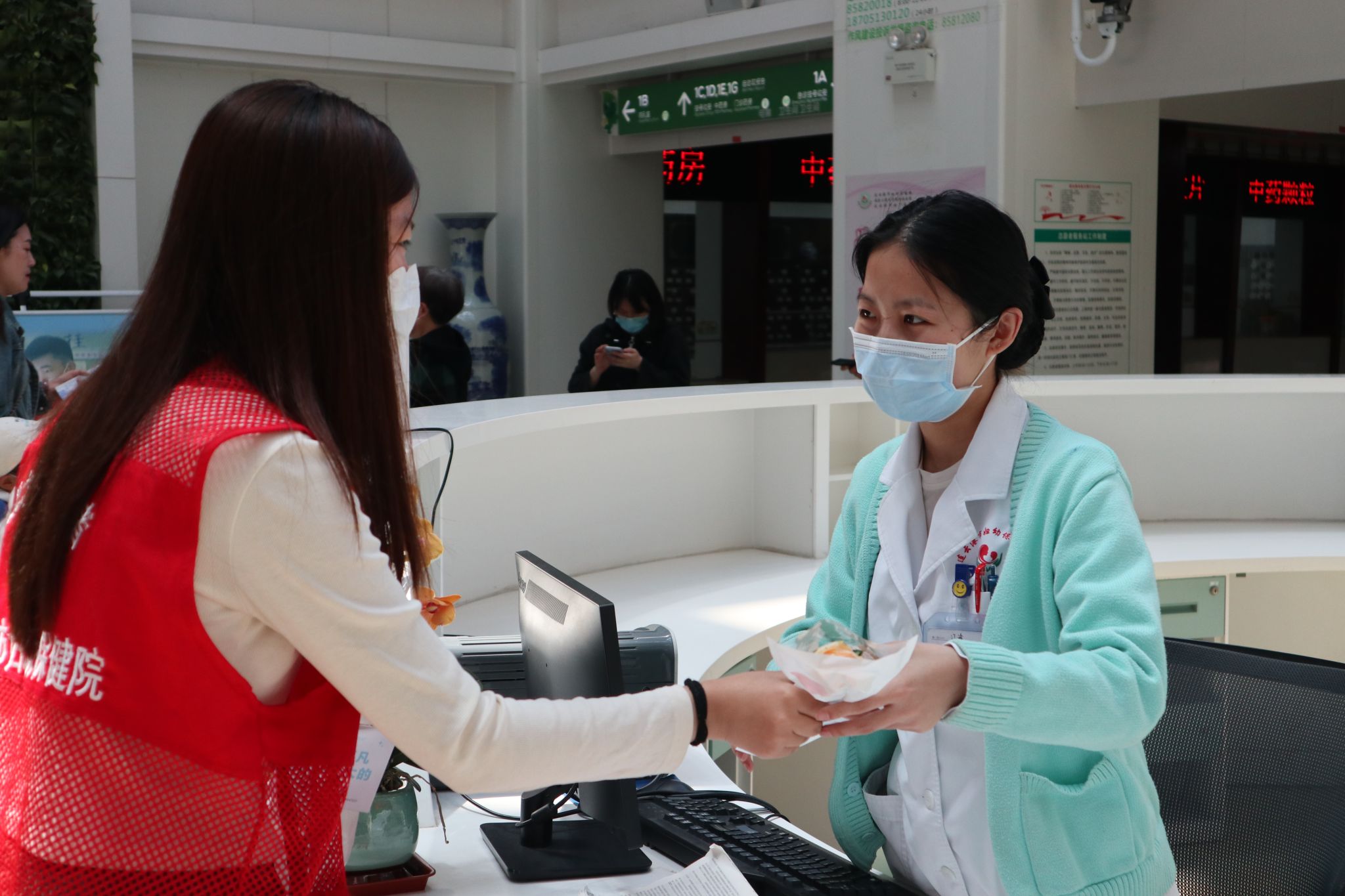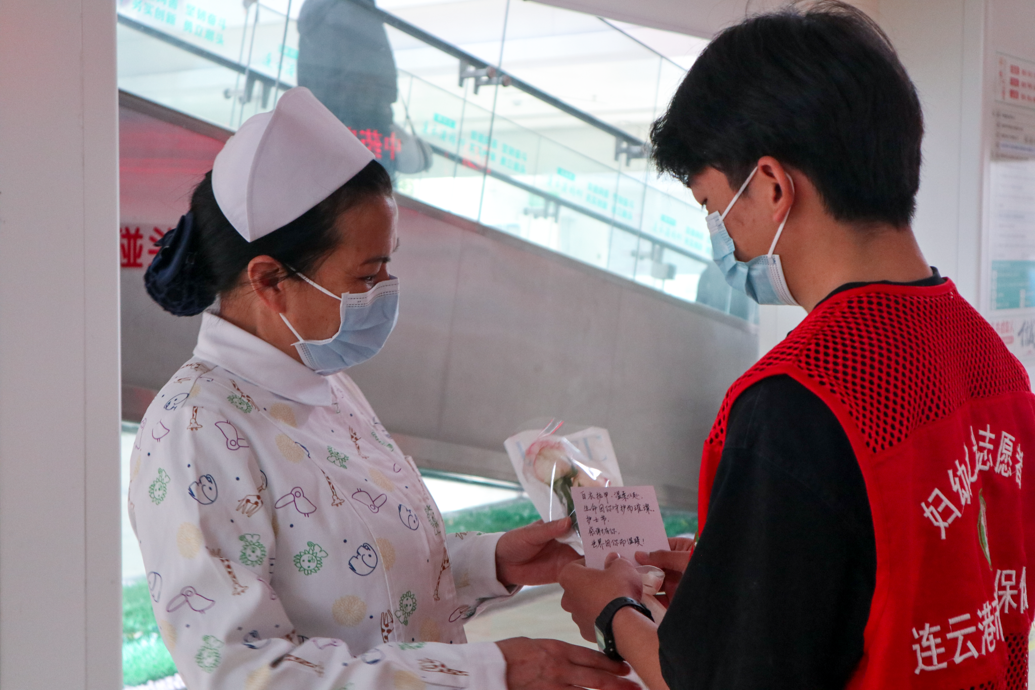 当天上午,志愿者们在医院各科室不同服务岗位上提供力所能及的导医导诊志愿服务,服务广大患者及其家属,为医务工作者分忧。在导医导诊志愿服务结束后,大家前往各个护士站为各位美丽伟大的白衣天使们送上鲜花和贺卡,贺卡上写满各位志愿者对医护人员崇高的敬意,而鲜花则深深表达了对各位医护人员在救死扶伤中做出巨大贡献的感谢。