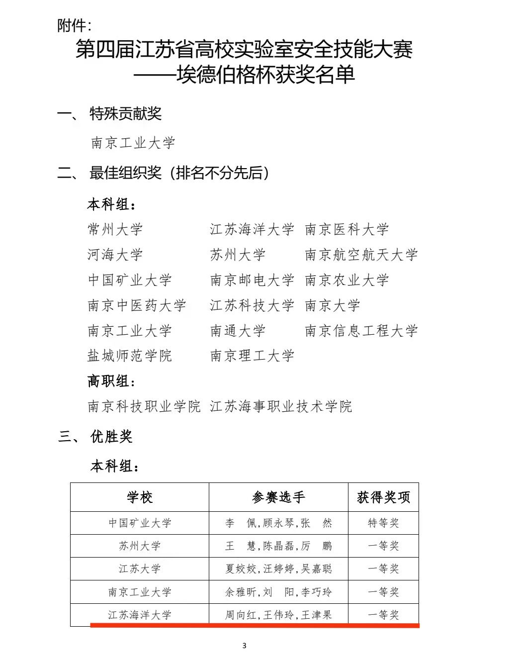 在3月22日于常州大学举办的第四届“江苏省高校实验室安全技能大赛”-埃德伯格杯中,我院周向红、王津果及药学院王伟玲3位老师组成的代表队,凭借出色的专业素养和团队协作,荣获大赛一等奖,为学校争得殊荣!