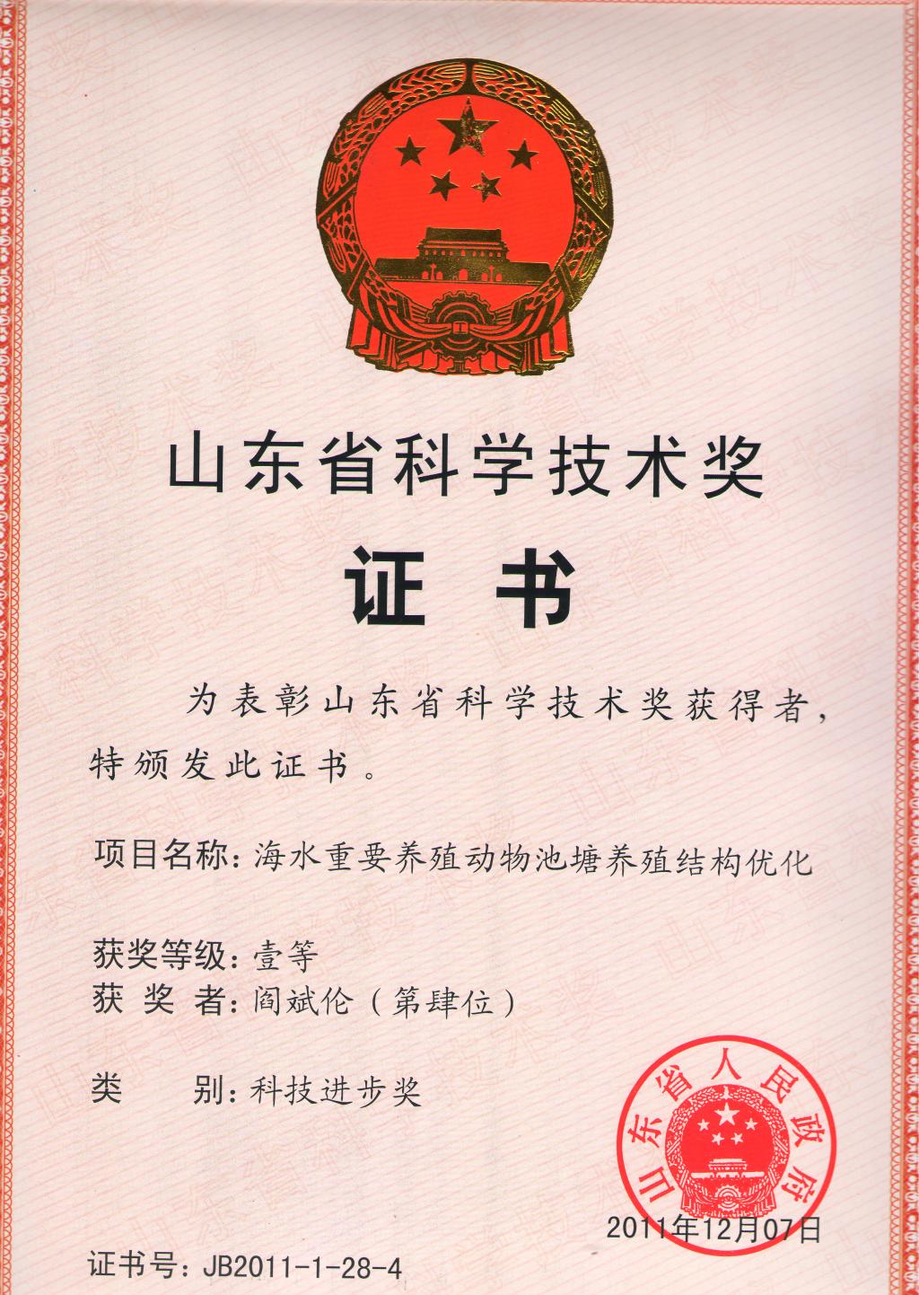 山东省科技进步一等奖