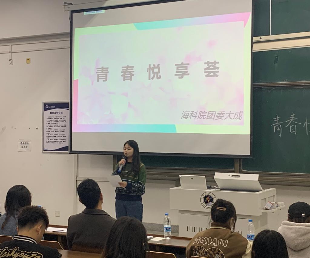 活动在海环1211班石梦琪嘹亮的歌声中拉开帷幕,一首《他们说》点燃了现场观众的青春热情。既然是青春,又怎么离得开书籍,来自生技201班的冯钰婷向大家推荐了一本经典读物——《山茶文具店》,与观众一同分享她与书的青春故事。如若人世间存在天使,那么志愿者肯定是其中一员,来自养殖201班的王慧敏声情并茂地为现场观众讲述了其参加志愿服务的青春历程,从她的分享中,每个人都能体会到青春的活力与奉献的快乐。随后各个选手将自己的表演一一呈现,他们或热情开唱,或深情朗诵,或分享故事,或现场教学……选手们精彩的表演深深感染着在场的每一位观众,现场时不时响起热烈的掌声。