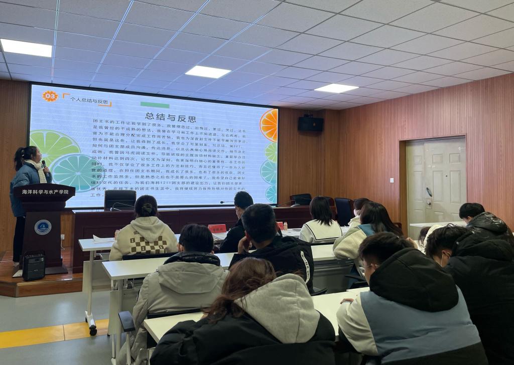 会议伊始,杨光简要地介绍了答辩的流程及答辩的评分标准。首先上场的是养殖202班的团支书高铭轩。他详细地阐述了他对团支书工作的认识和看法,并向大家展示了他在团支部组织建设方面策划的形式新颖的团日活动。随后上场的是生技201班的团支书姚文洁,她表示团支书作为班级的榜样示范要不断地提升自我,同时她也指出了自己在工作中的不足,希望在接下来的工作中能不断完善。生技1211班团支书包翔文,他用自己制作的视频回顾了这一学期工作,他表示好的决策会增强集体的凝聚力,并希望在下学期能带领团支部继续前进。最后进行工作展示的是海环1211团支部,首先由团支书陈紫罗进行工作总结,她表示创新和实践才能培养出更优秀人才,班级组宣委员周瑀越对后期团支部工作展示了计划措施并进行了展望。最后荣获本学期学院优秀团支部的是养殖202、生技201、生技1211和生技1212。