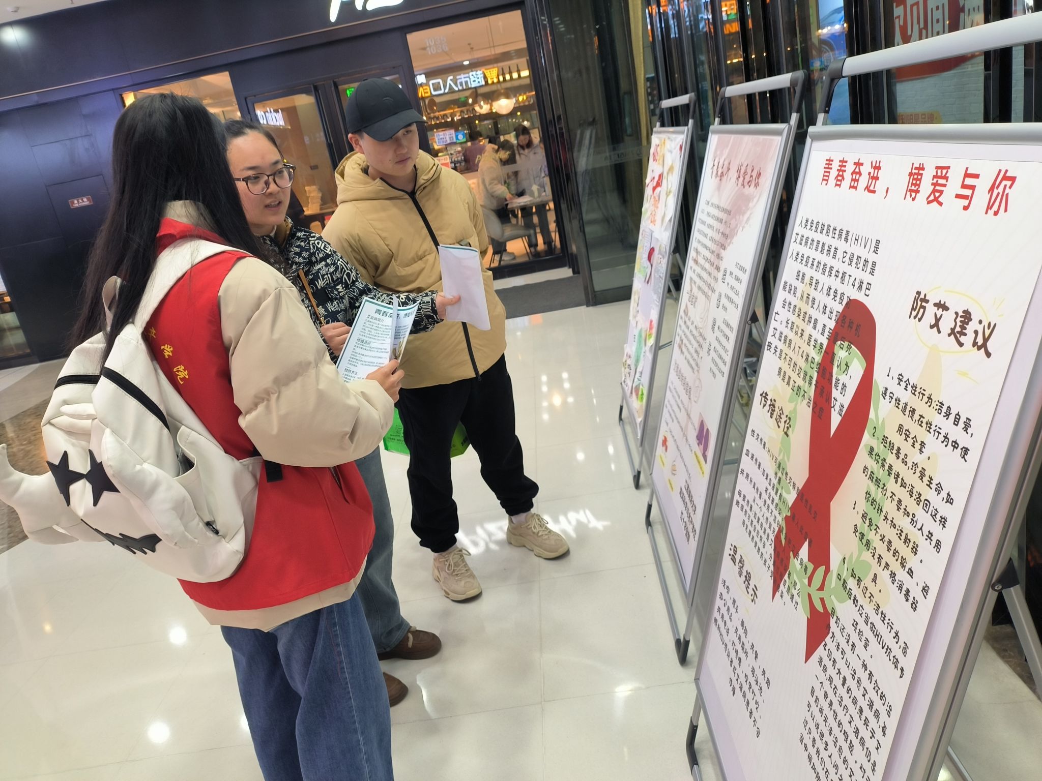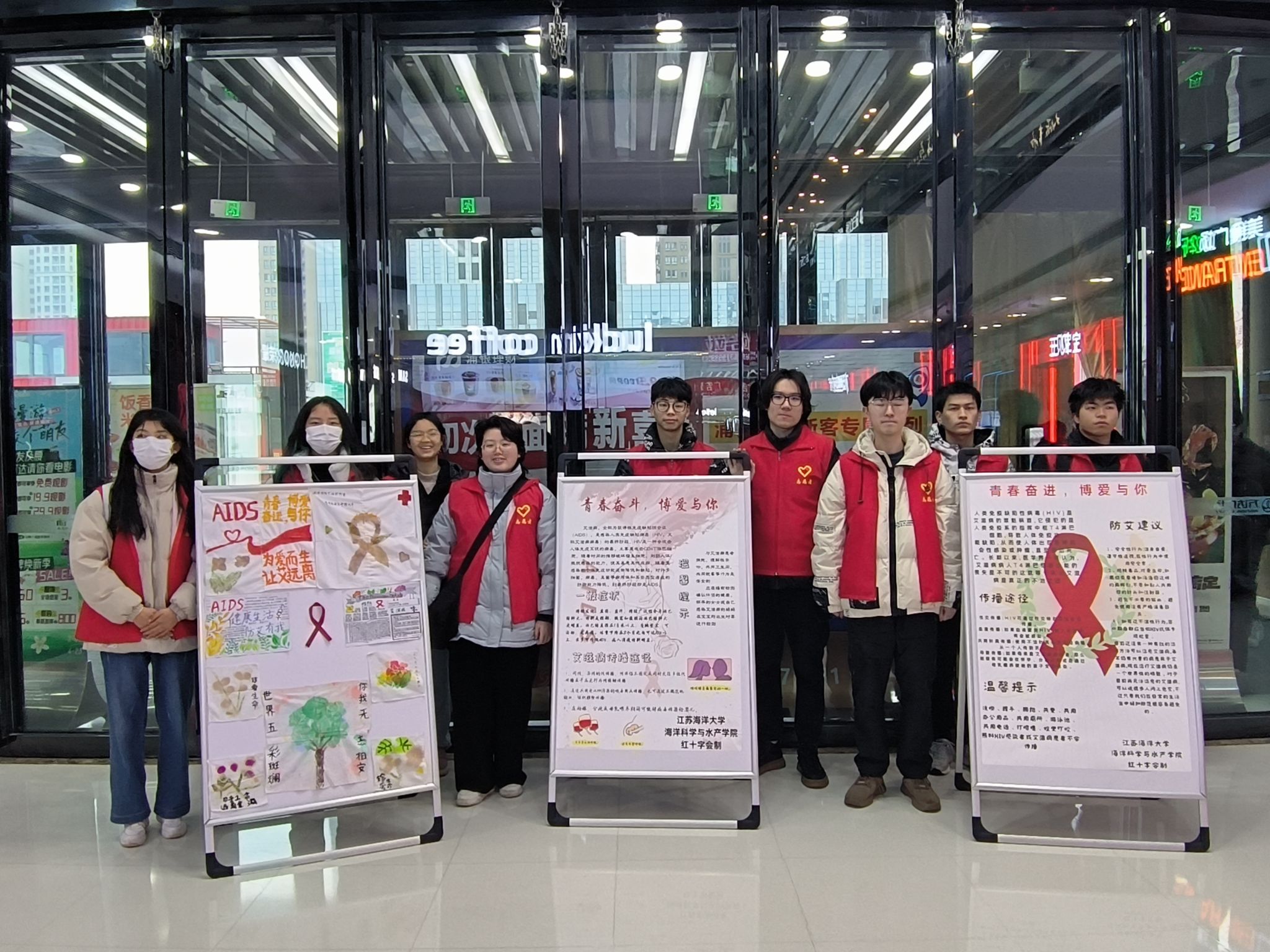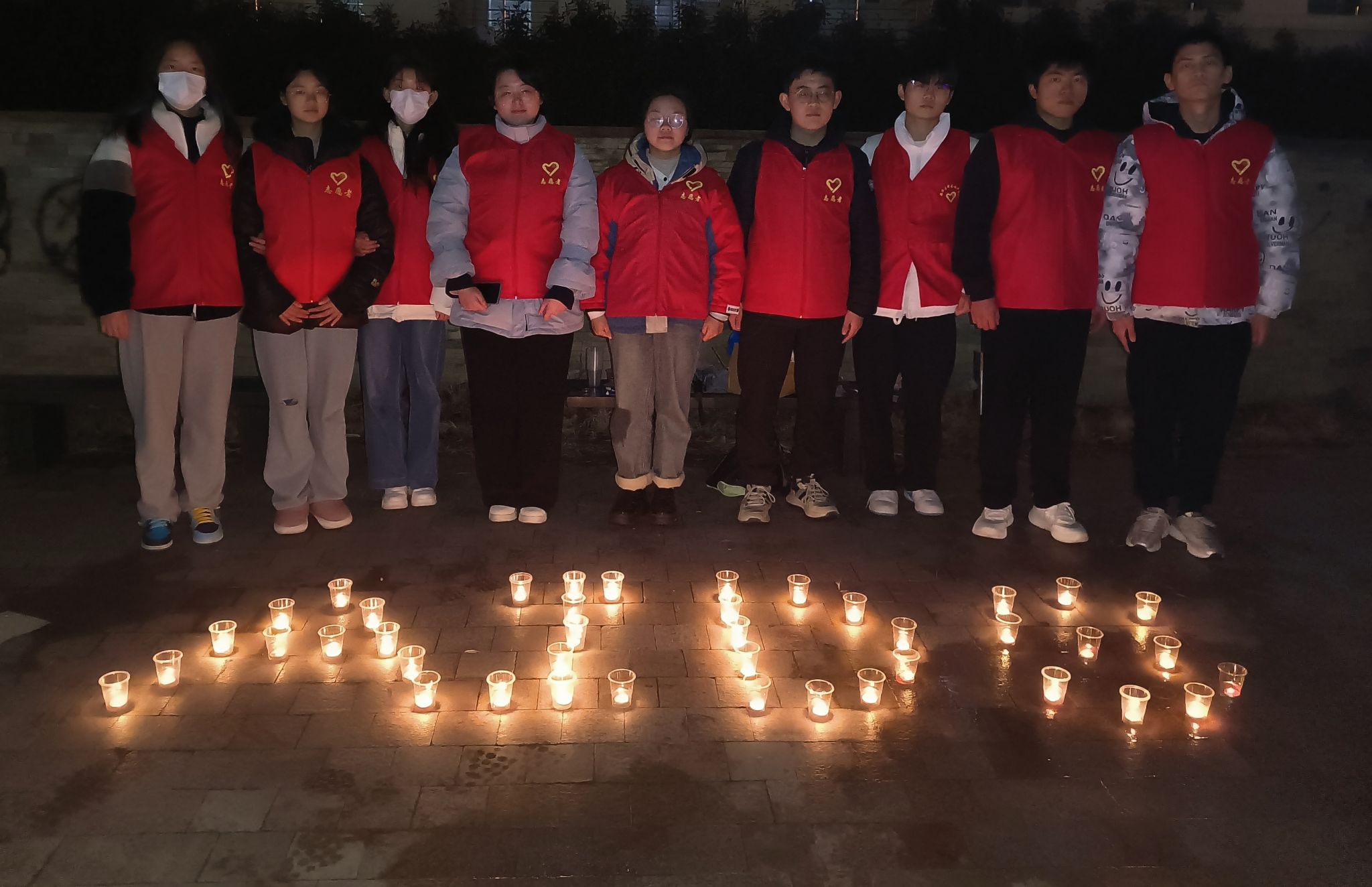 3月5日,学生志愿者们于连云港市万达广场举办了主题为"传承雷锋精神,共筑防艾长城"的防艾宣传教育活动。为过往行人提供关于艾滋病防控及如何检测预防的专业知识。夜幕降临,红十字志愿者齐聚苍梧校区西操场,举办了一场别开生面的蜡烛标语活动。志愿者们点燃蜡烛,将它们巧妙排列,呈现出“防艾”“AIDS”“红丝带”的形状。这些蜡烛在漆黑的夜晚中摇曳生辉,明亮的烛光不仅象征着生命和希望,更为整个校园带来了一片温馨的光景,熠熠生辉。