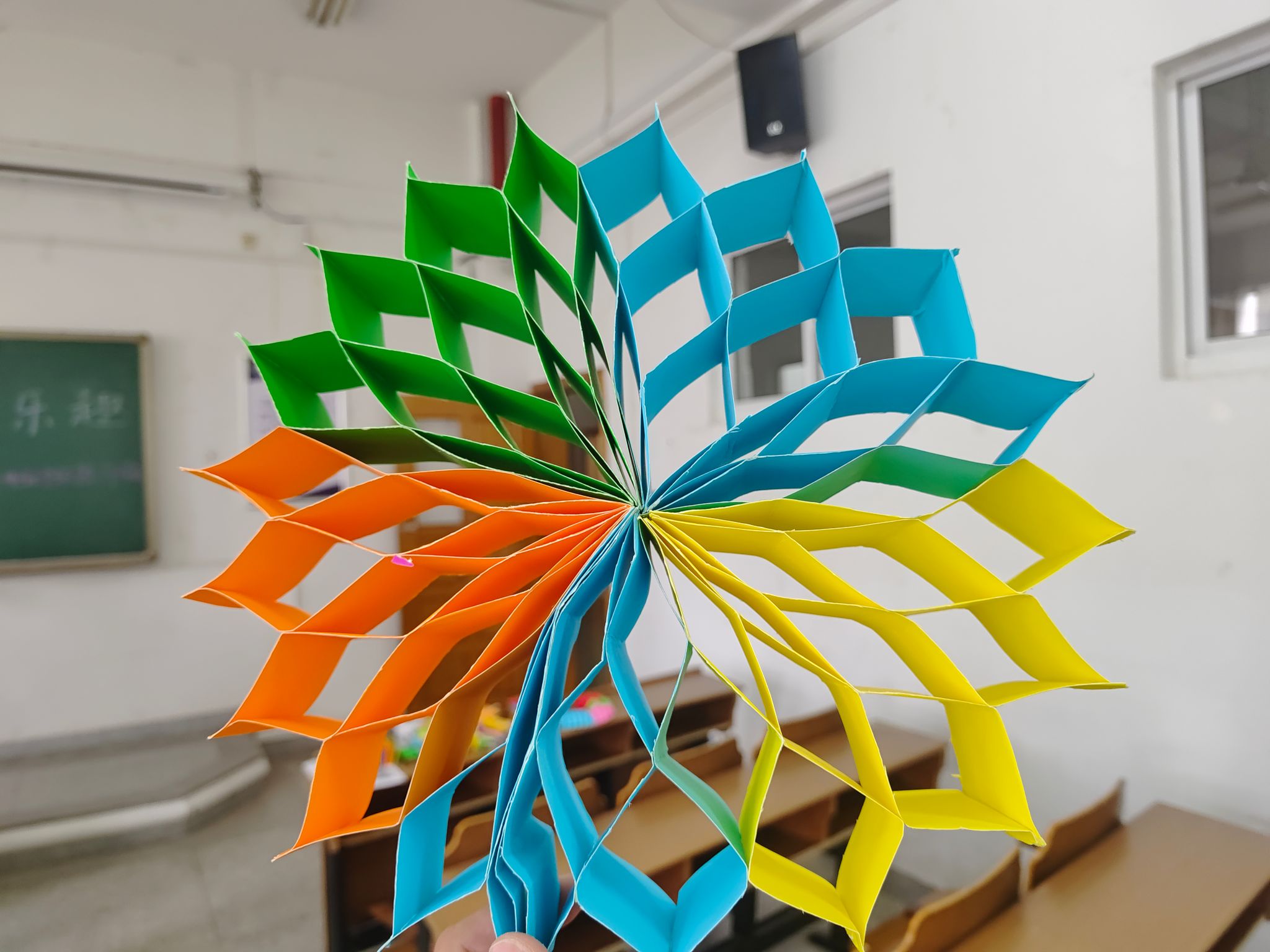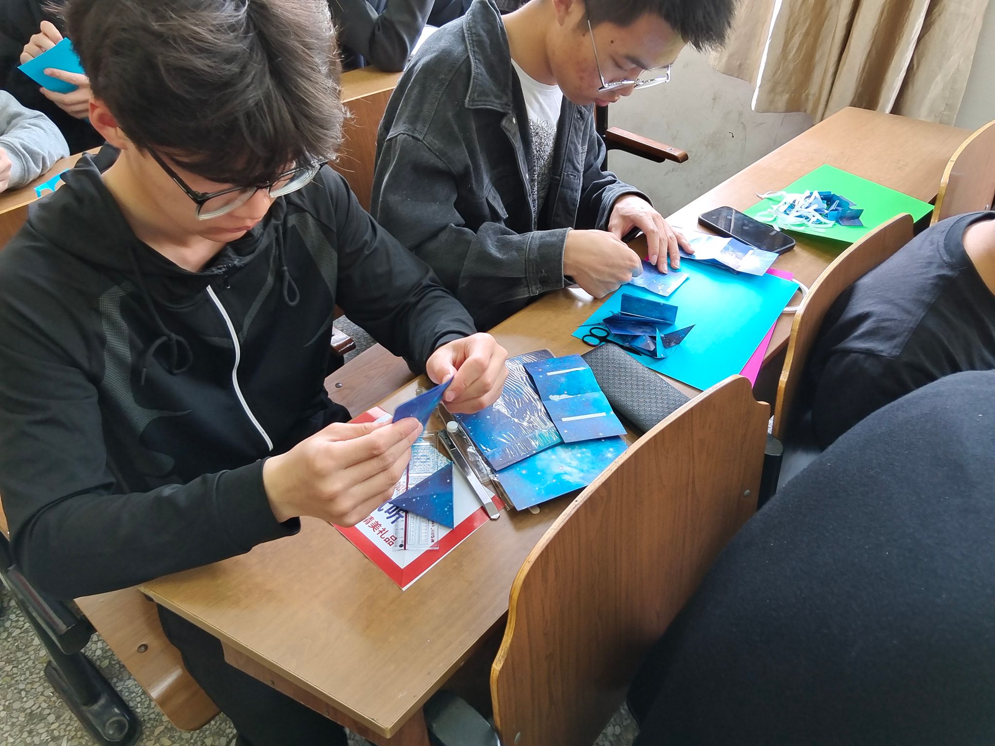 活动伊始,同学们按要求分组领取了活动材料和工具,依据教程的指导,开始创作翻花作品。在整个过程中,同学们认真思考,热情讨论并努力寻求创新翻花的样式。从设计翻花的形状,到剪裁色彩不一的彩纸,并用裁剪好的彩纸折叠成不同的部件,最后粘贴组合,每一步都有条不紊地进行着。同学们沉浸在制作翻花的乐趣中,刀锋在纸间游移,纸屑窣窣落下,色彩渐渐生动起来,创作出了一幅又一幅个性鲜明的作品:腾飞的舞龙、变化的折扇、巧妙的拱桥……各有各的风格与特点。完成作品的同学纷纷拍下照片以作纪念。最后,工作人员为优秀小组送出了精美礼品,本次活动圆满结束。