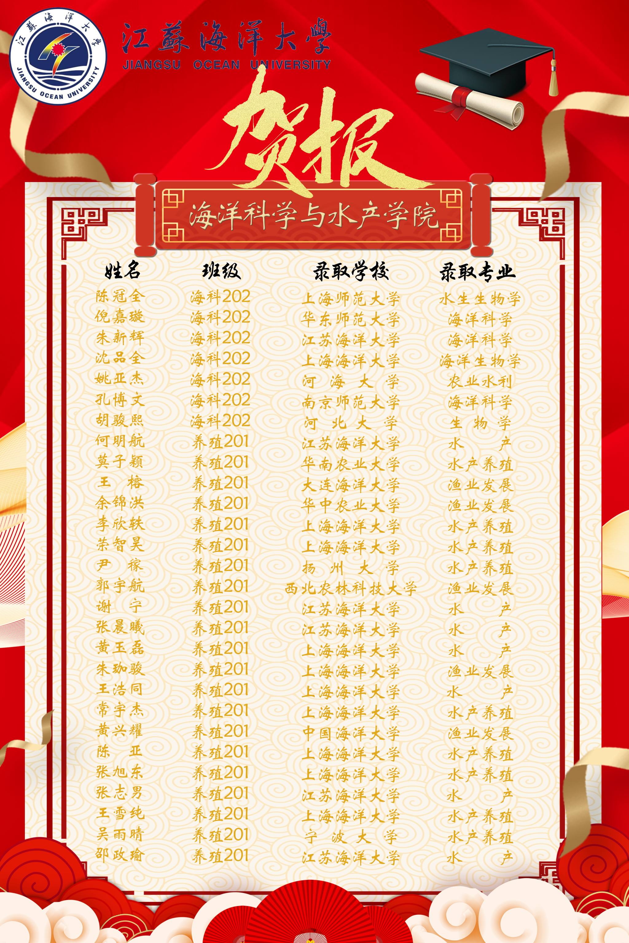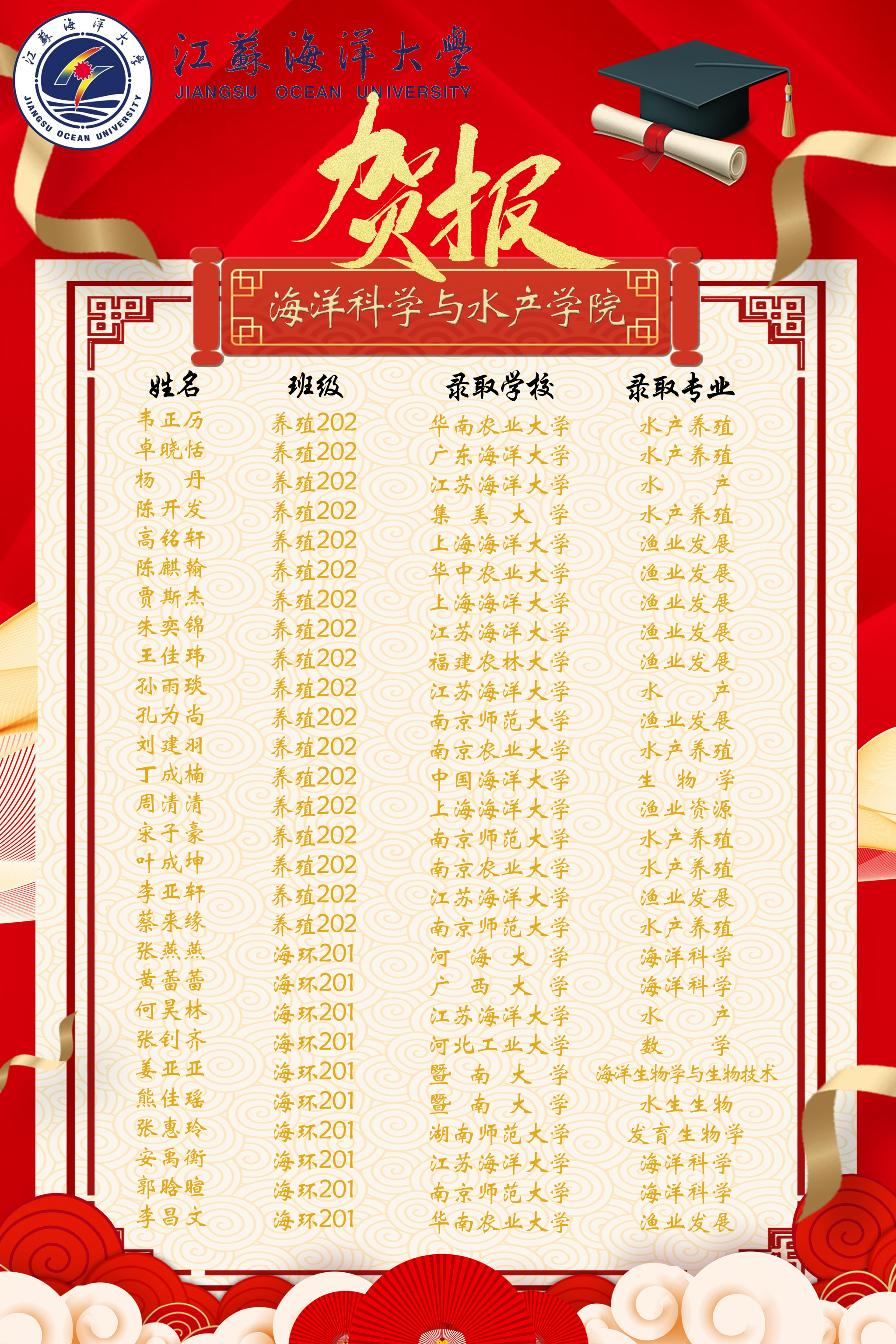 随着2024年考研结果陆续出炉,888集团welcome喜报频传,本科生考研录取率再创新高:学院2024届本科毕业生考研录取人数113人,考研录取率46.1%,其中69名同学考取华东师范大学、中国海洋大学、中国科学院大学、西北农林科技大学等“双一流”建设高校。养殖201班、海科202班考研录取率分别达到63.6%及60%,学院B7-416、B7-420、A5-419、A5-423四个宿舍实现了全员“上岸”。