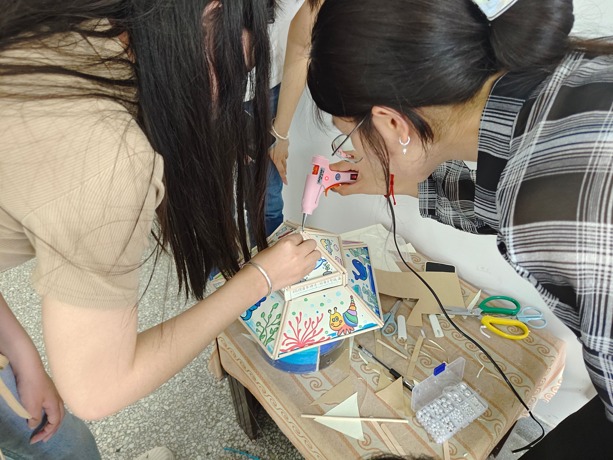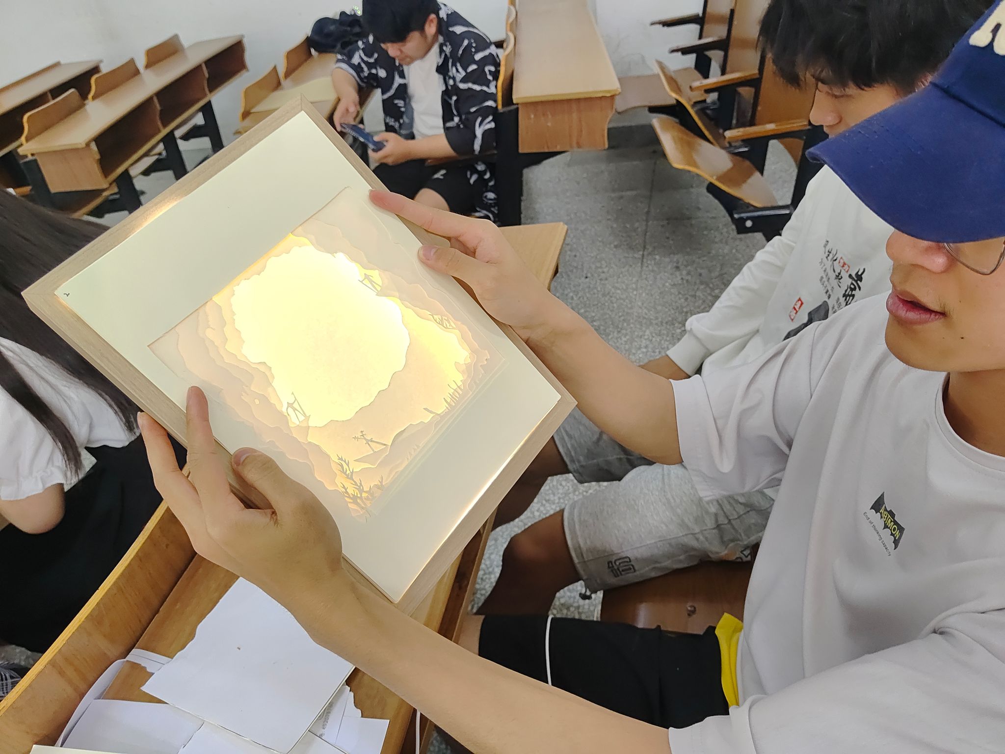 活动伊始,同学们按要求自行组队并领取了活动材料和工具,四人为一个活动小组开始了创作。同学们使用牛皮纸和不同颜色的卡纸,通过剪裁、雕刻、镂空、拼接、堆叠等方法组合出不同的形状和花纹,融入组员们的奇思妙想,用创意的思维和灵巧的双手为大家奉上了一场创意盛宴,经过大家齐心协力,创作出了一盏盏充满创造性又兼具美观的牛皮纸灯罩:刻刀雕刻出海底鱼儿与海草共舞、海面船舶与海浪交织的意境;画笔绘制了鲸鱼遨游大海,海鸥展翅翱翔的自由,在灯光的映射下,显现出别样的魅力。
