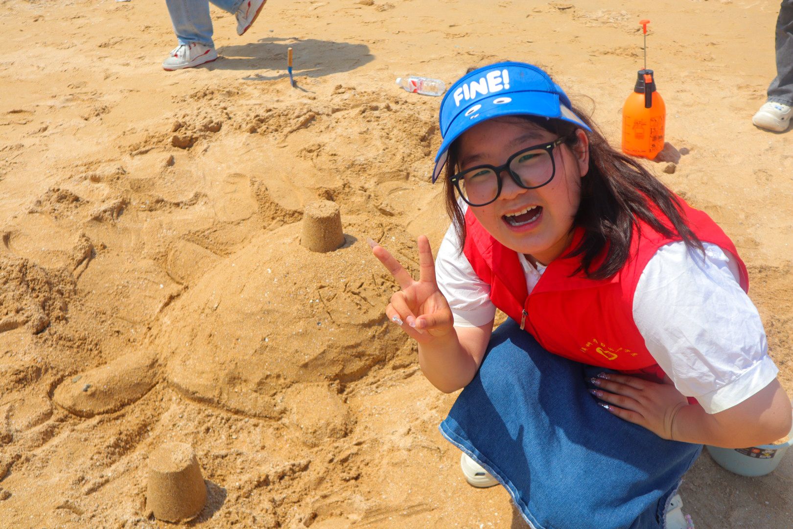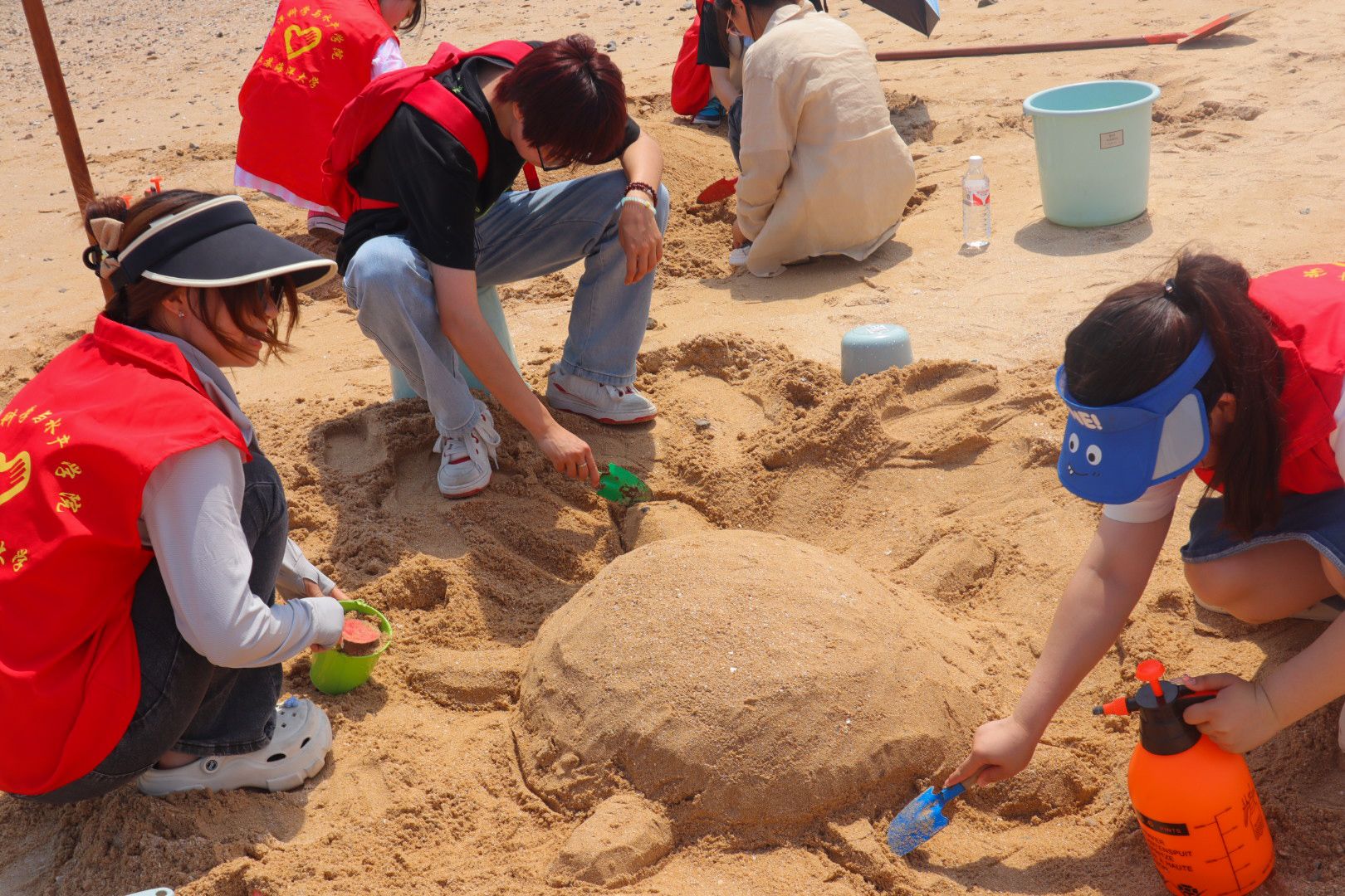被称为“大地艺术”的沙子雕塑,其魅力在于以纯粹自然的沙和水为材料,通过创作后呈现迷人的视觉效果。活动伊始,同学们按要求分组领取活动材料和工具,依照原先的设计方案,开始创作沙子雕塑作品。同学们在海滩边密切配合,铲沙、堆沙、淋水、踩实,再用铲刀从沙堆顶部往下雕刻、筑造。很快,坚固的“堡垒”、可爱的“熊”,栩栩如生的“海龟”等沙子雕塑作品呈现在观众面前,吸引了路人驻足观赏。同学们的作品或可爱有趣,或表达了对保护海洋生物、海洋环境的思考,创意十足的作品展现了广大学子的创造力。