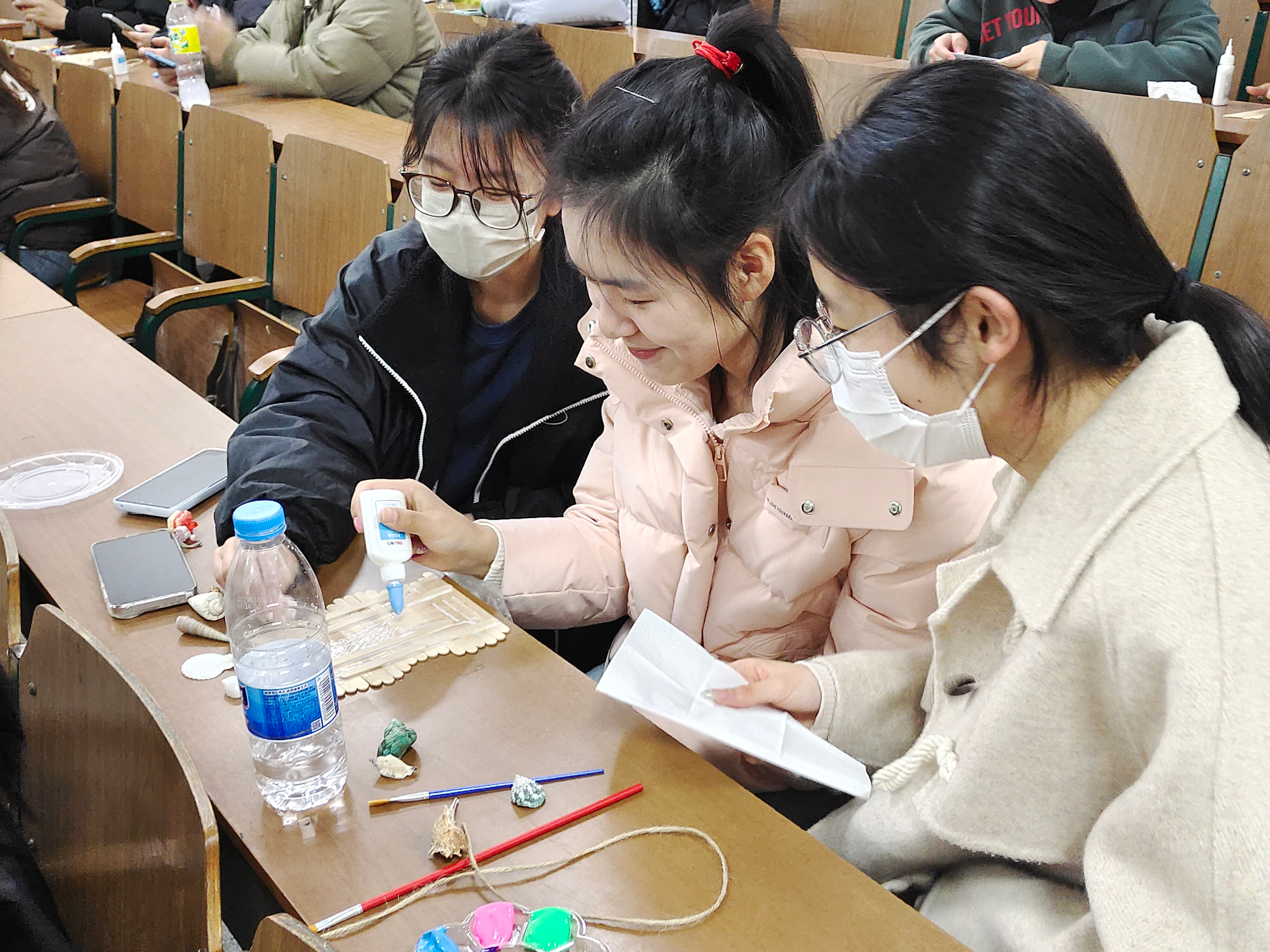 活动现场,五彩缤纷的贝壳、形状各异的雪糕棒、闪亮的装饰品等材料一应俱全。同学们热情高涨,纷纷化身“设计师”,用灵巧的双手将贝壳和雪糕棒进行裁剪、拼接、粘贴,并点缀上精美的装饰。