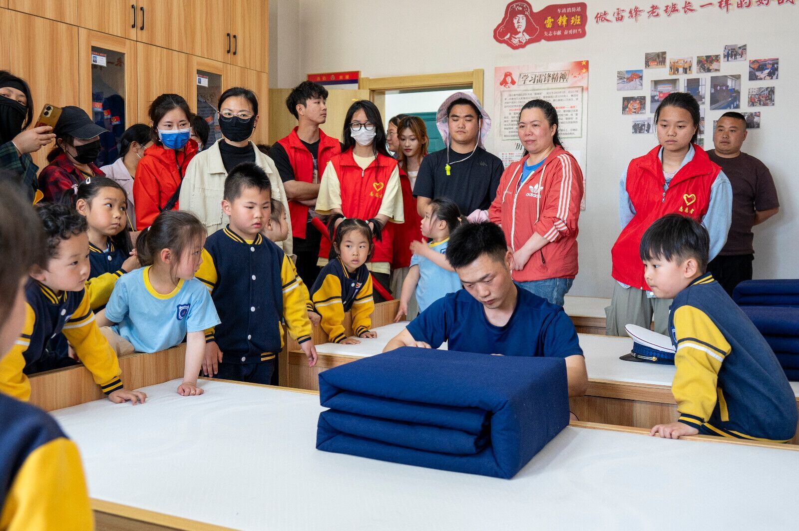 在互动体验环节,消防员首先示范了快速穿脱消防服的标准动作。随后,小朋友们换上特制的迷你消防服,化身"小小消防员",参与了趣味十足的"障碍爬行"模拟救援训练。当走进消防员宿舍时,整齐划一的物品摆放和棱角分明的"豆腐块"被子引得孩子们发出阵阵惊叹,严谨的内务管理让孩子们深刻感受到消防队伍的纪律性。在逃生演练环节,孩子们认真学习用湿毛巾捂住口鼻、弯腰低姿撤离的要领,掌握了基本的火灾逃生技能。