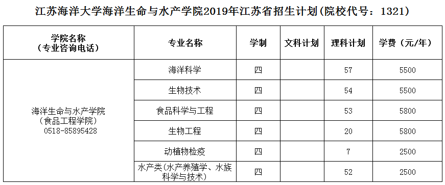 海洋生命与水产学院2019年江苏省招生计划