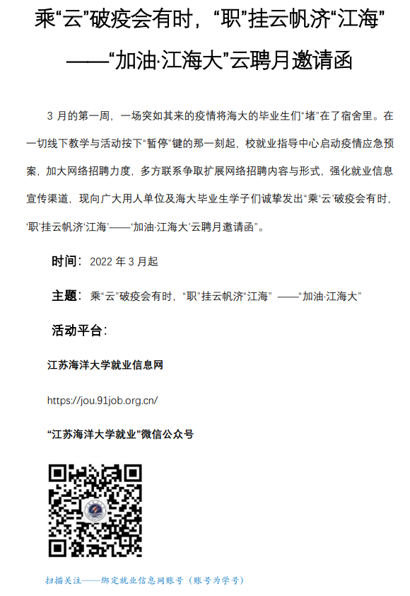 乘“云”破疫会有时,“职”挂云帆济“江海” ——“加油·江海大”云聘月邀请函