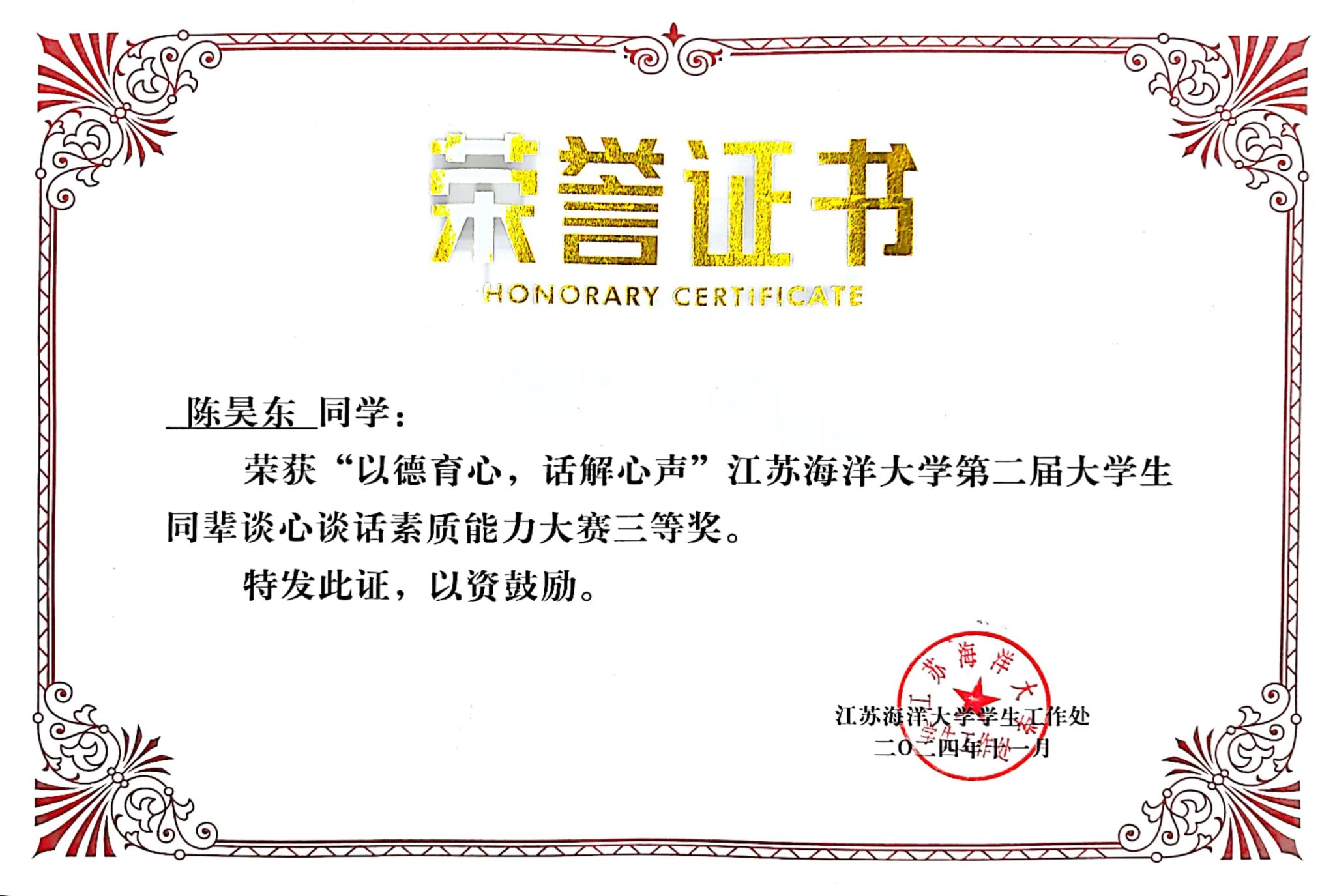 陈昊东,女,2006年3月生,汉族,共青团员,海洋科学专业24级本科生,现担任海洋科学1242班团支书、学院学生会外宣部干事。荣获welcometo欢迎光临888集团同辈谈心谈话素质能力大赛三等奖、学院廉洁文化演讲比赛一等奖、院学生会“优秀部员”等荣誉。